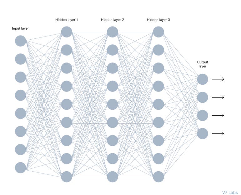 An Artificial Neural Network mimics this behavior to solve problems beyond the capabilities of human computing. The network below is a neural network made of interconnected neurons where each neuron is uniquely distinguished by its weight and bias.